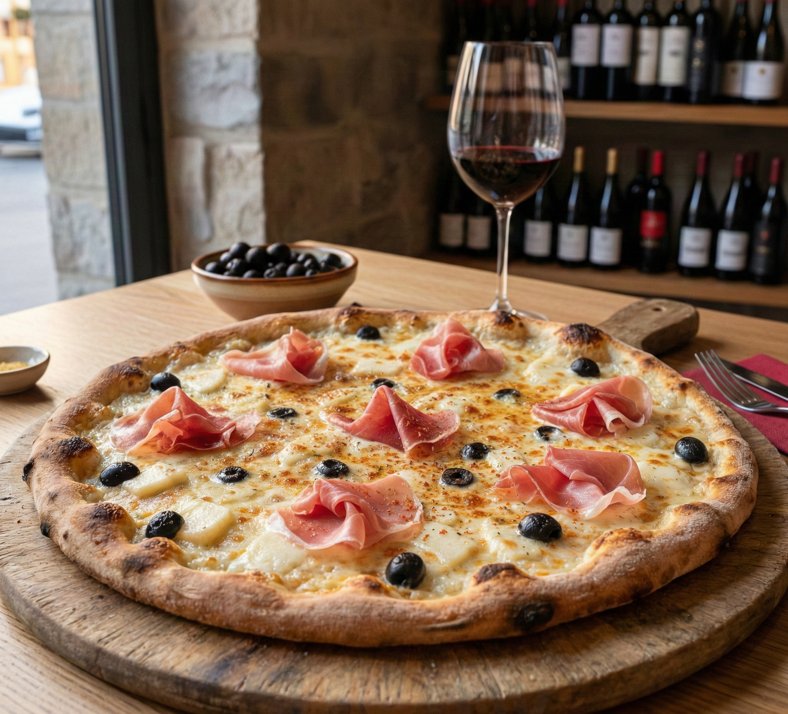 Une pizza de caractère ! Succombez à l’onctuosité d’une base crème garnie de fines olives et d’un mélange de fromages, sublimée par de la Tome de brebis au piment d’Espelette. Le tout est couronné, après cuisson, par un jambon de Parme d’exception pour une explosion de saveurs authentiques.